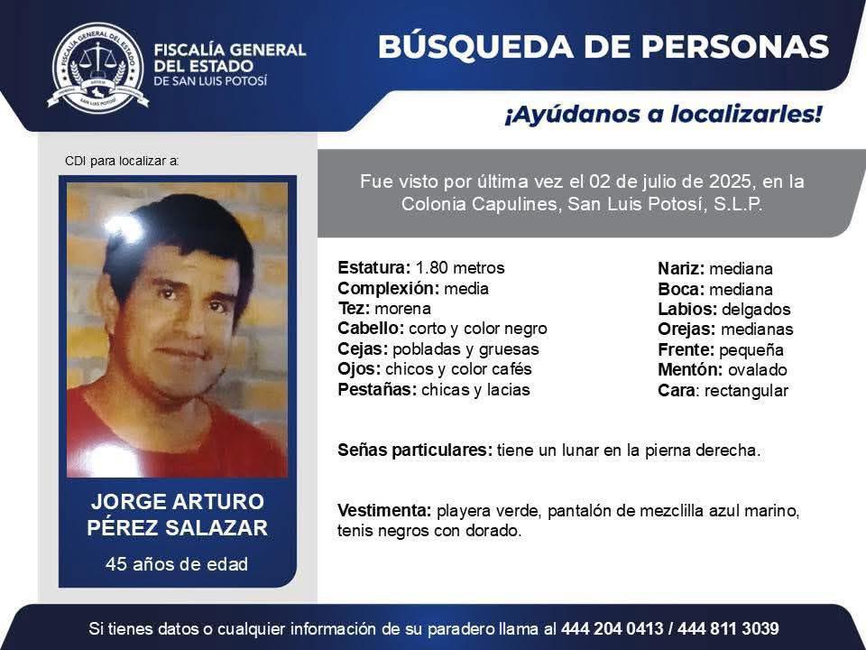 La Fiscalía General del Estado de San Luis Potosí solicita el apoyo de la ciudadanía para localizar a Jorge Arturo Pérez Salazar, de 45 años de edad.