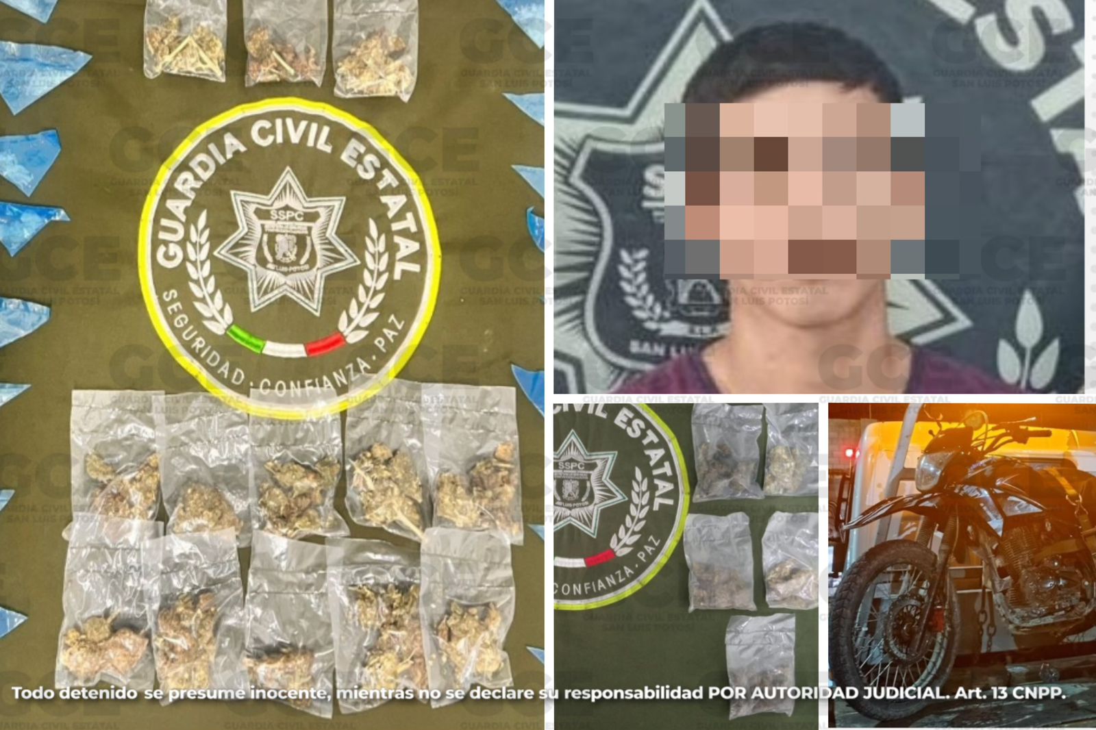 Se han implementado dispositivos específicos para combatir el tráfico de sustancias ilegales en la Huasteca potosina, con el objetivo de garantizar espacios seguros para todos. Como resultado de estos operativos, se logró la detención de Rolando “N” de 23 años y de una menor de edad de 17 años en la colonia El Carmen, en el municipio de Ciudad Valles, asegurándoles cinco dosis de “cristal” y cinco bolsas con marihuana, además de una motocicleta.