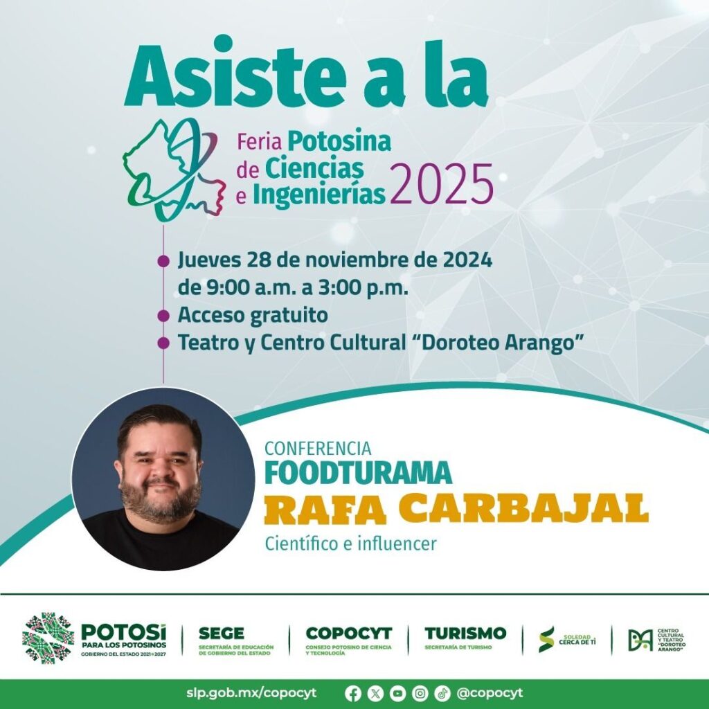 El Consejo Potosino de Ciencia y Tecnología (Copocyt), invita a la ciudadanía a asistir a la Feria Potosina de Ciencias e Ingenierías 2025 el próximo jueves 28 de noviembre de las 09:00 y hasta las 15:00 horas, en el Teatro y Centro Cultural “Doroteo Arango” ubicado en Soledad de Graciano Sánchez.