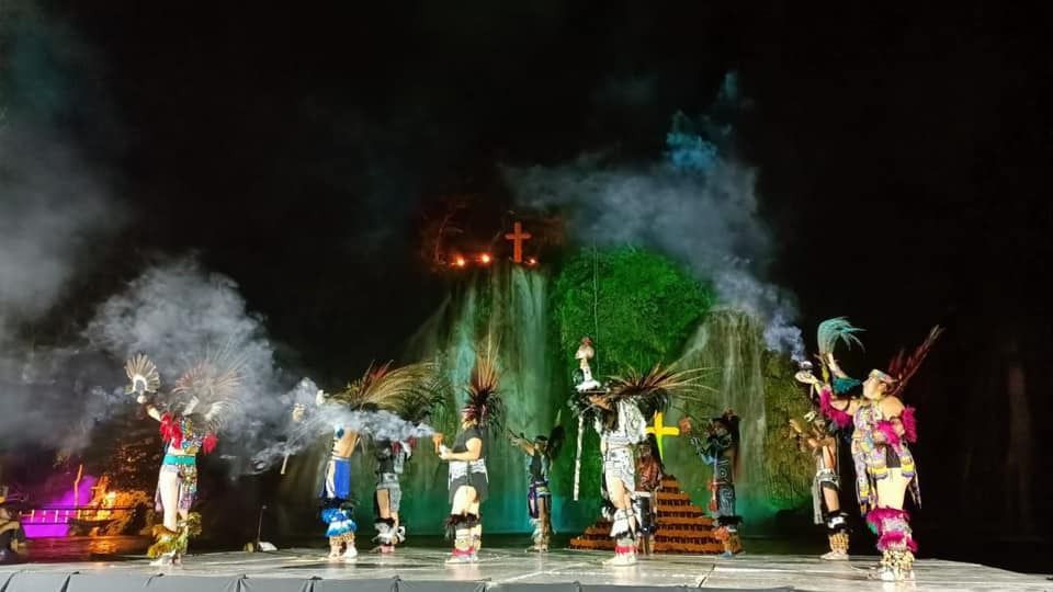 Con luces que iluminaban las espectaculares caídas de agua, el entorno natural de Tamasopo se transformó en un escenario vibrante de colores, danzas y música que evocan el respeto y la conexión con los ancestros en un ambiente lleno de vida y espiritualidad.
