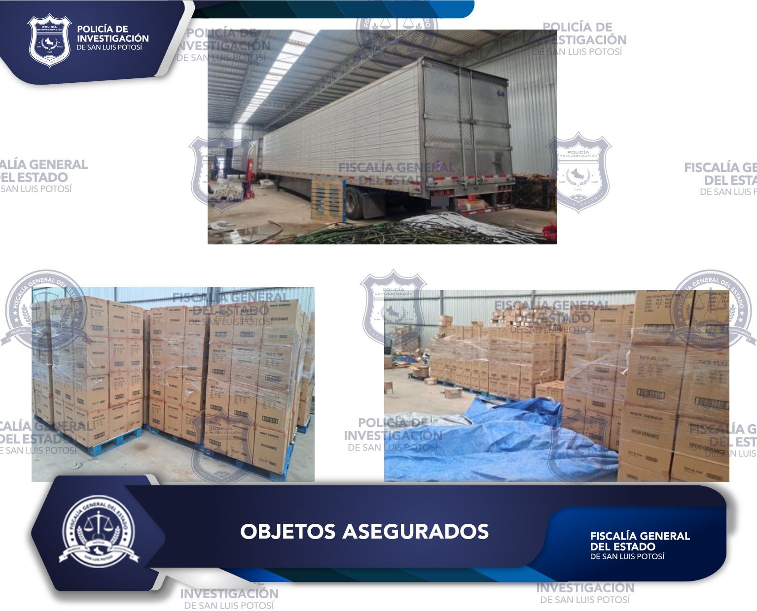 También se localizaron diversas tarimas con otros productos como artículos de higiene personal, electrodomésticos, objetos de papelería, golosinas, partes para vehículos y neumáticos.