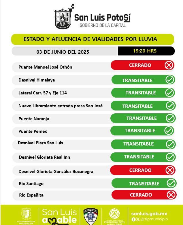 Como medida preventiva y para garantizar la seguridad de las personas, se mantiene el cierre temporal de las siguientes vialidades: el desnivel Manuel José Othón, el desnivel de la glorieta González Bocanegra y el paso vehicular sobre Río Españita.