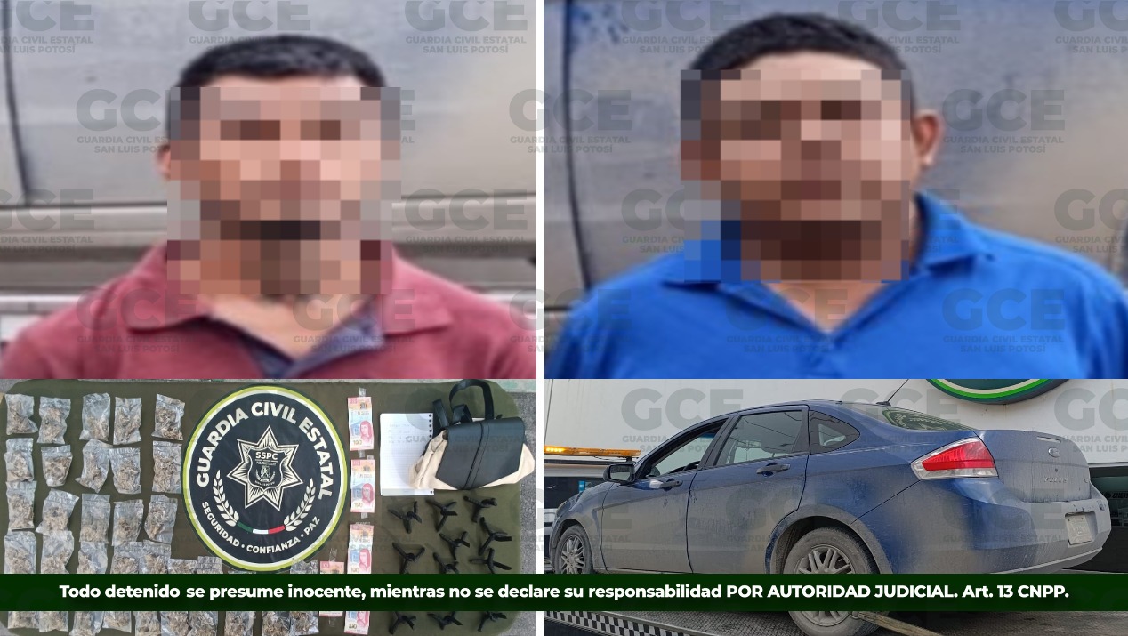 Derivado de acciones permanentes y de los operativos de seguridad y vigilancia en los 59 municipios, la Guardia Civil Estatal (GCE) detuvo en Ciudad Valles a Alfonso “N”, de 29 años, y Víctor “N”, de 27 años, por su presunta responsabilidad en delitos contra la salud.