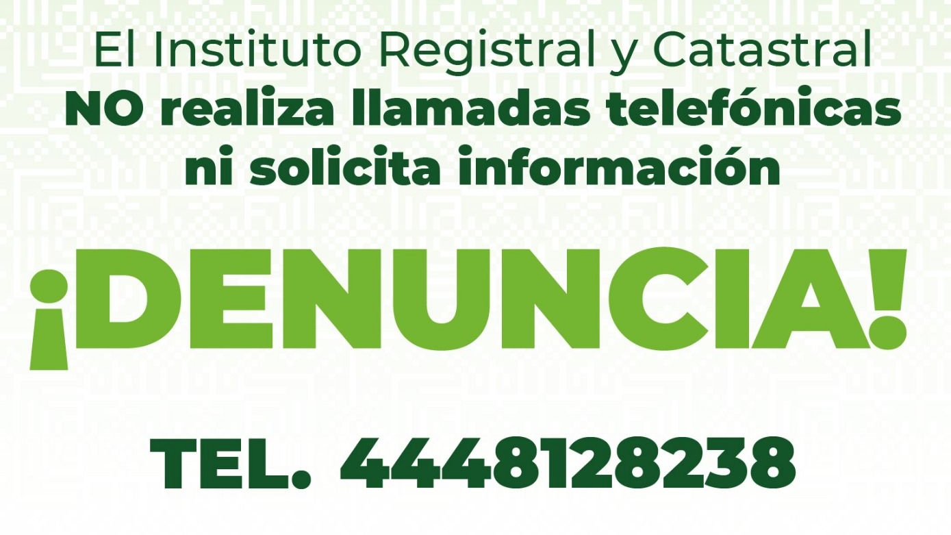 El Instituto Registral y Catastral (IRC), alertó a la población para evitar ser víctima de fraude, pues detectó que, a través de llamadas telefónicas, supuestos gestores solicitan datos para enviar trámites de avalúos, sin embargo, puntualizó que la institución no atiende mediante ese medio y todos los trámites se realizan de forma presencial, por lo que recomendó colgar de inmediato y evitar brindar cualquier información.