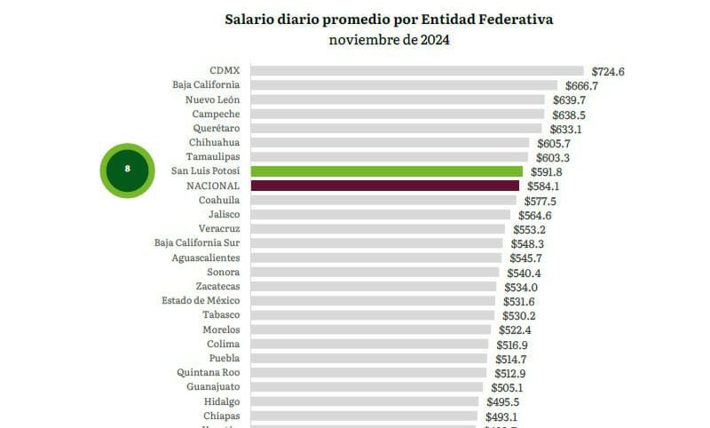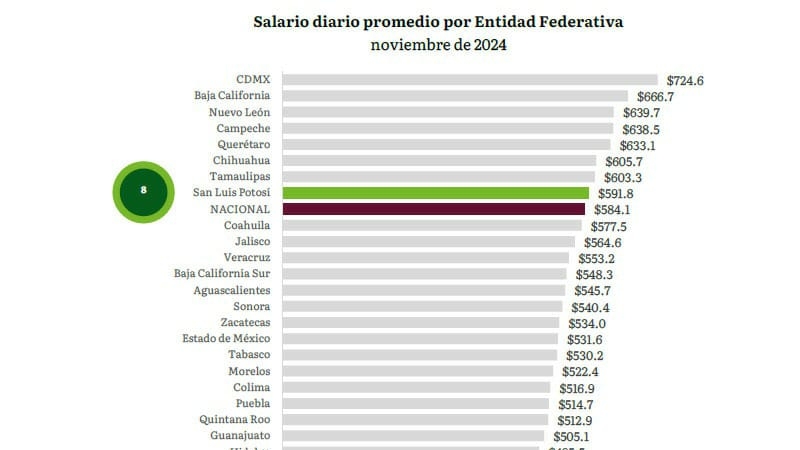 San Luis Potosí logró colocarse al cierre del 2024 entre las entidades con mejor percepción salarial, registrando un salario promedio base de cotización al Instituto Mexicano del Seguro Social (IMSS) de 591.8 pesos diarios; resultado de la estrategia económica del Gobierno Estatal, que acerca más apoyo a las y los potosinos en materia laboral.